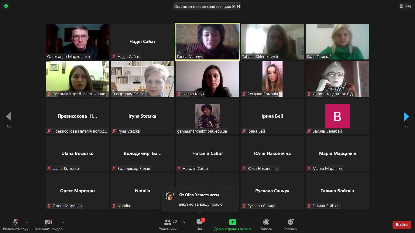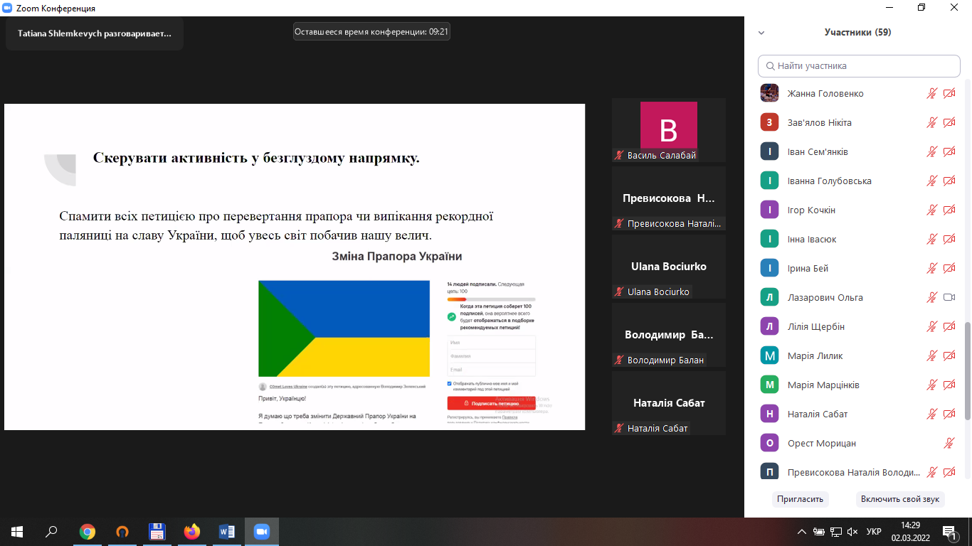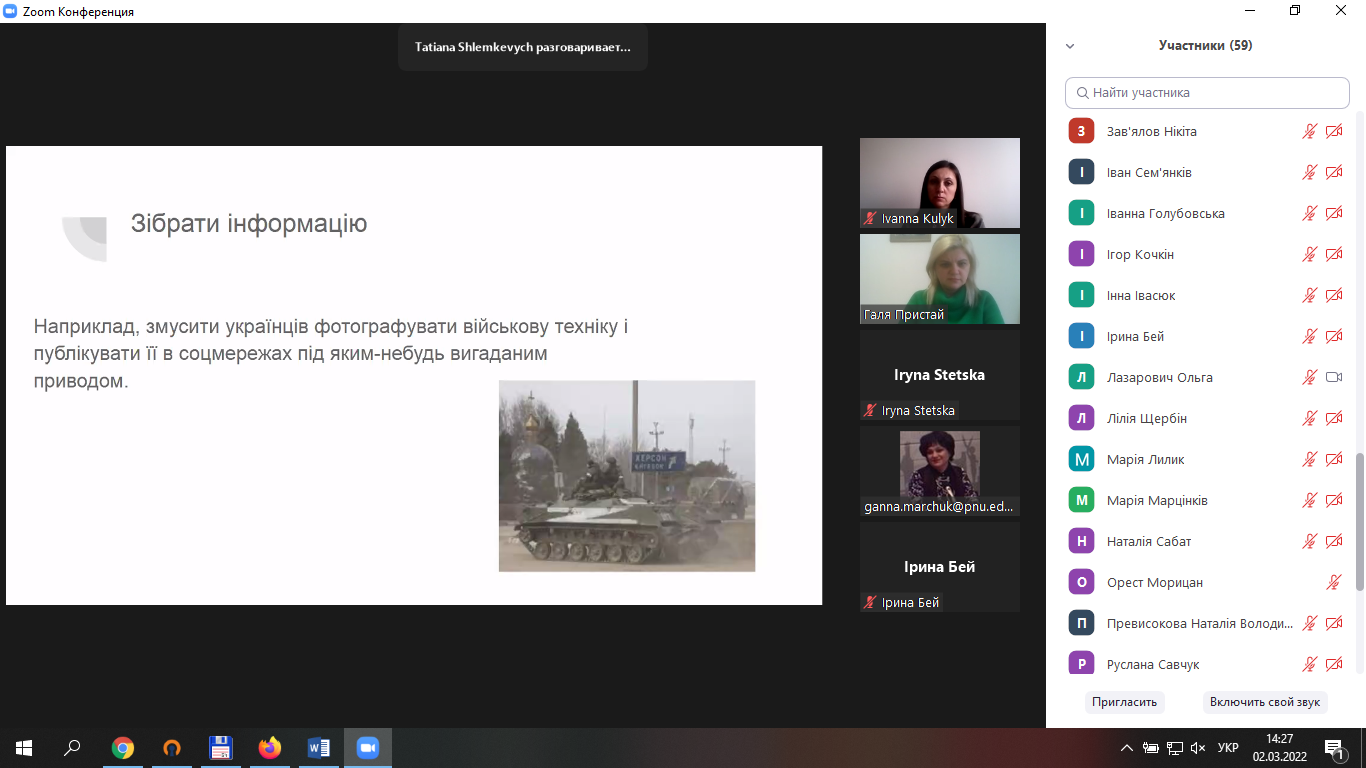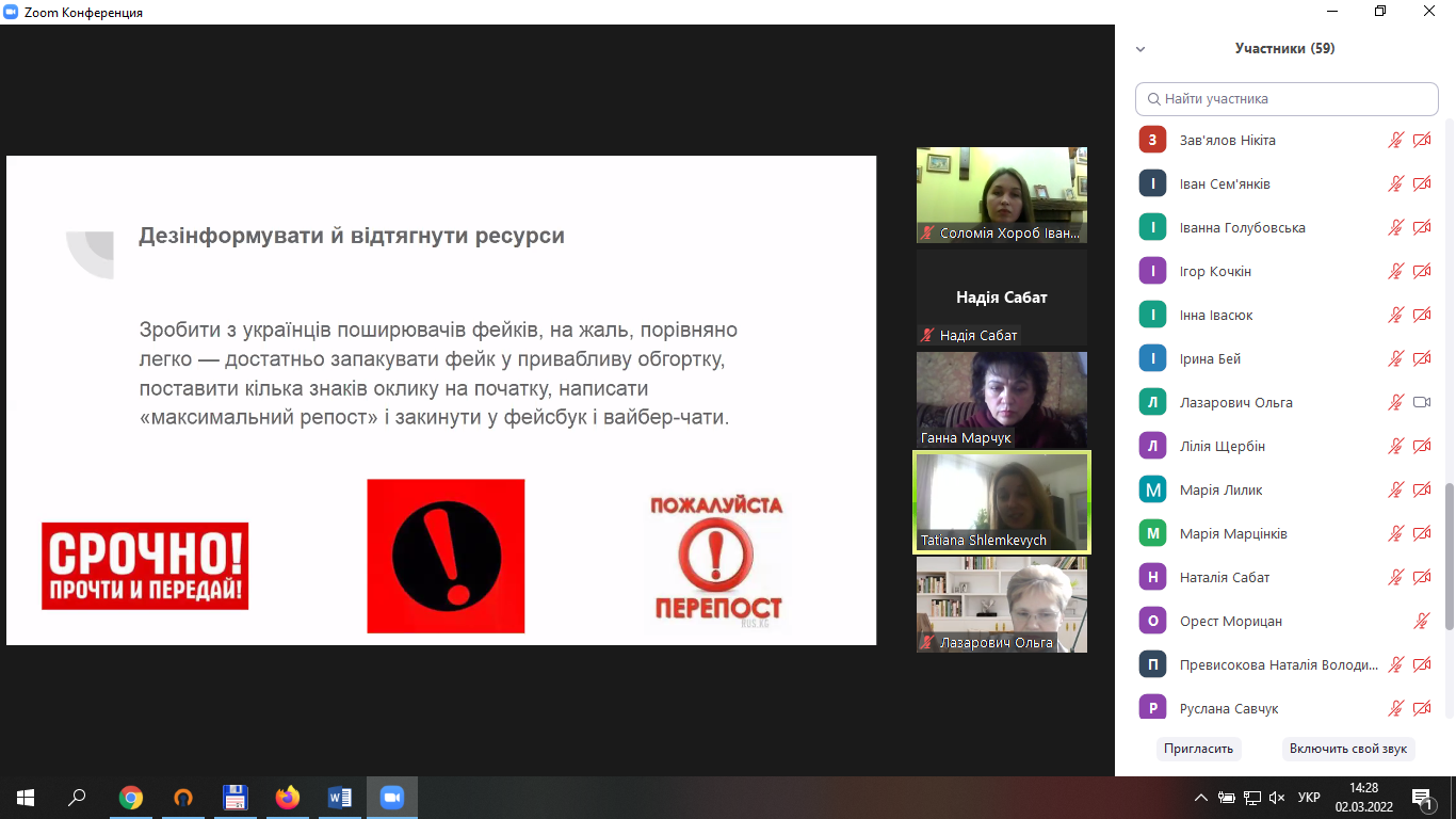 2 березня викладачі кафедри соціальної педагогіки та соціальної роботи взяли участь в онлайн тренінгу «Інформаційна безпека під час військових дій», організованому викладачами кафедри журналістики. У виступах йшлося про шкоду від постійного читання новин, що призводить до коливання емоцій, перенасичення і, зрештою, до емоційного виснаження; про необхідність знання чіткого алгоритму дій у випадку загрози – адже тоді працює розумовий, раціональний аспект, отже, людиною важче маніпулювати, та про низку інших актуальних питань. Доповідачі застерегли присутніх від поширення фейків, закликали перевіряти рівень безпечності сторінок у соціальних мережах, не довіряти неперевіреній інформації, триматися самим і в інших підтримувати бойовий дух.