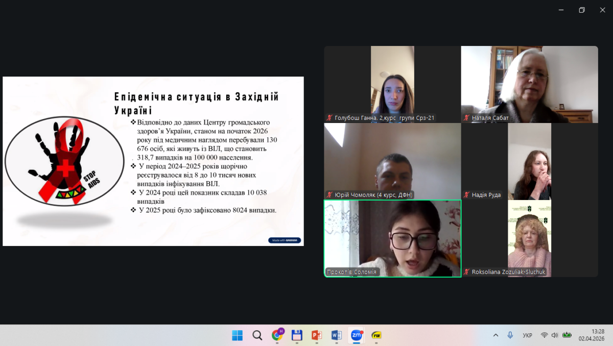 Соломію ПРОКОПІВ, здобувачку першого (бакалаврського) рівня вищої освіти. Тема виступу: «Особливості профілактики поширення ВІЛ/СНІДу в Західній Україні в умовах внутрішньої міграції». Науковий керівник – доктор педагогічних наук, професор Роксоляна ЗОЗУЛЯК-СЛУЧИК.