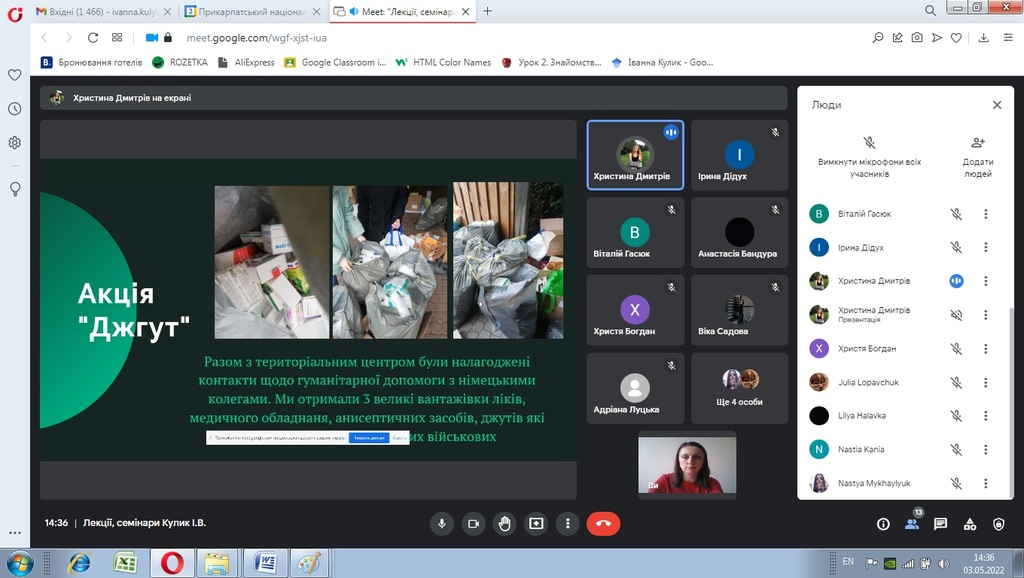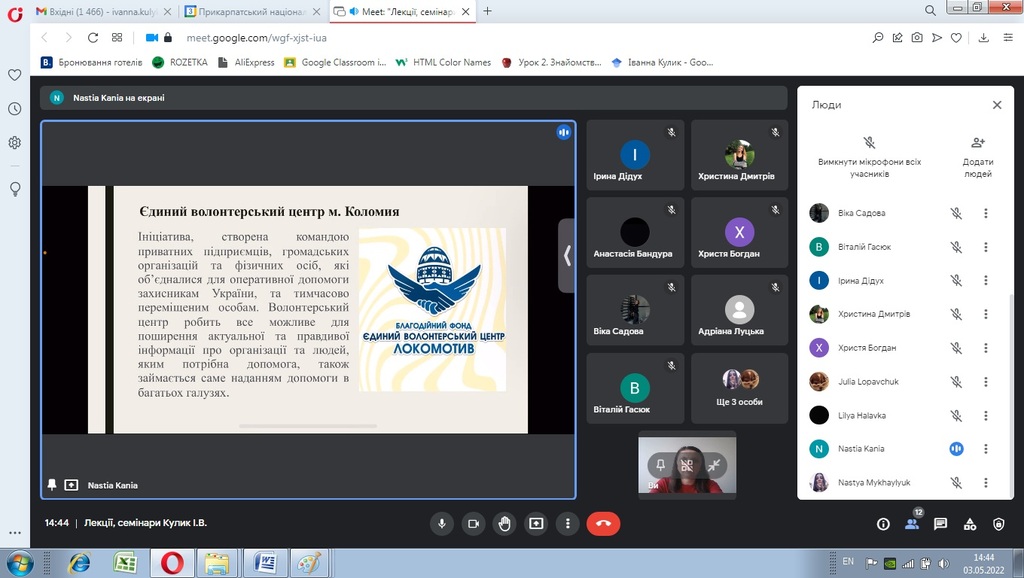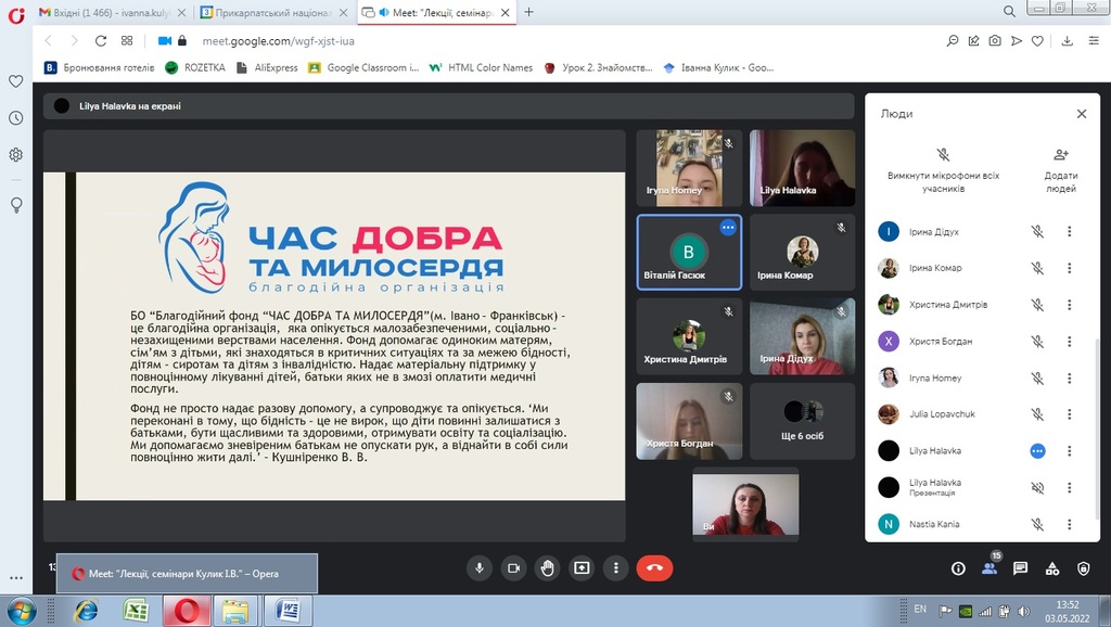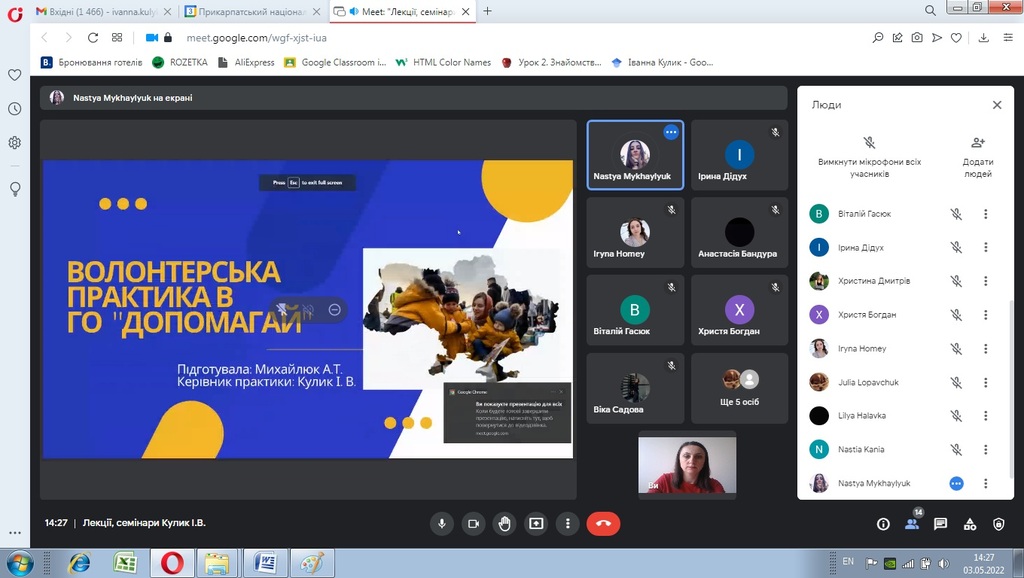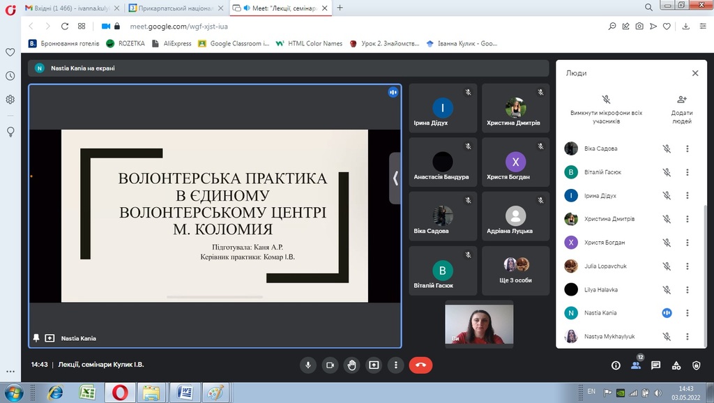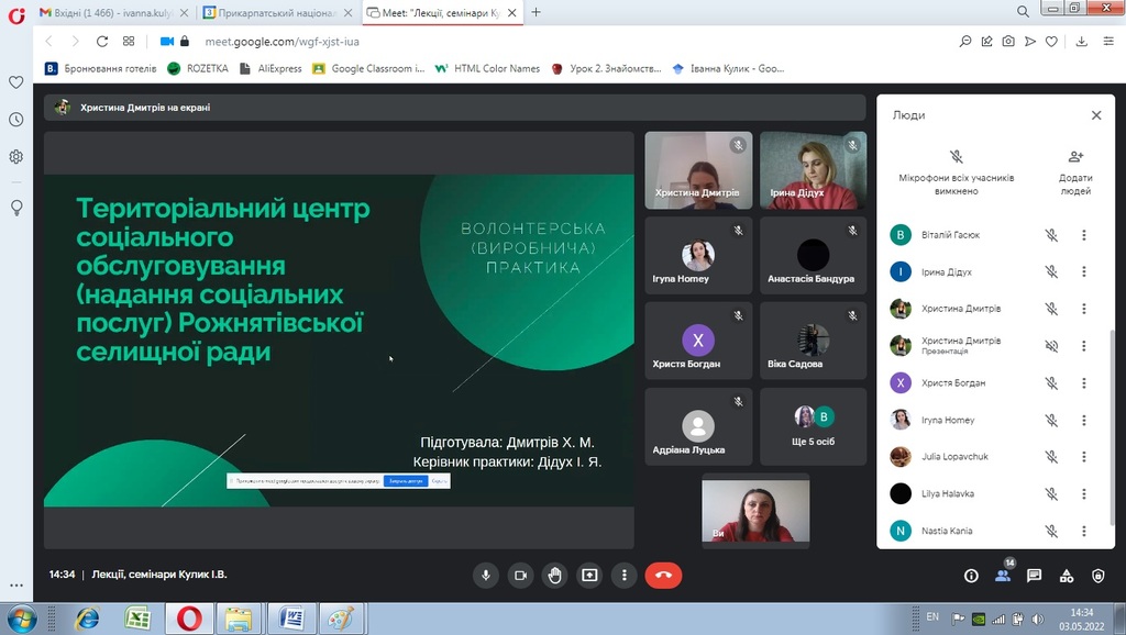 3 травня в онлайн-режимі на платформі Google Meet відбувся захист матеріалів виробничої волонтерської практики студентів групи СР-21 ОП «Соціальна робота», на якому були присутні: Іванна Кулик – факультетський керівник практики, Ірина Дідух та Ірина Комар – керівники-методисти виробничої волонтерської практики.
