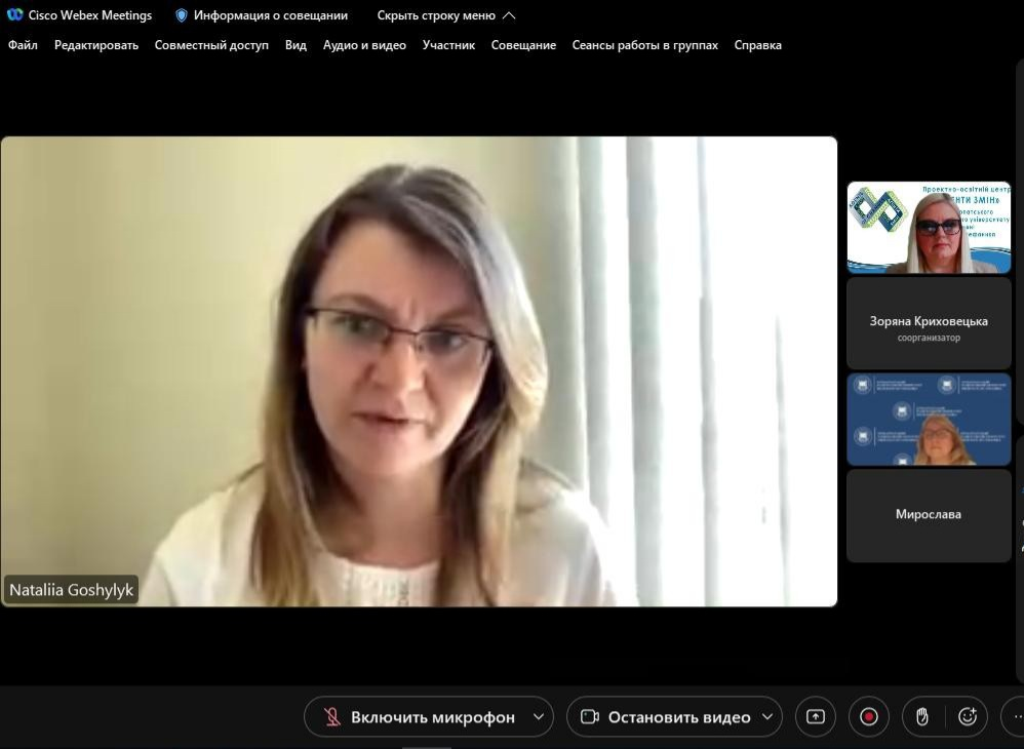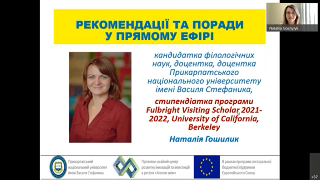 Родзинкою вебінару стала участь у прямому ефірі доцентки Прикарпатського національного університету імені Василя Стефаника, кандидатки філологічних наук, яка є на даний час стипендіаткою програми Fulbright Visiting Scholar 2021-2022, University of California, Berkeley Наталії Гошилик.