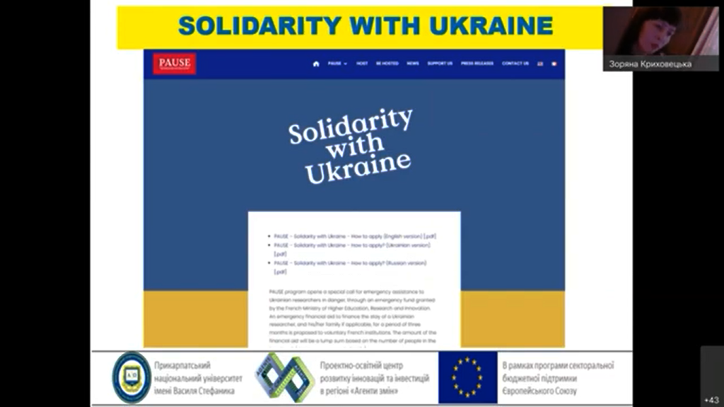 Проектно-освітній центр «Агенти змін» Прикарпатського університету за участю стипендіатки програми Фулбрайт провели вебінар для науковців, освітян, фахівців мистецької та інших сфер на актуальну  тематику«Грантові можливості та гуманітарні ініціативи для українських науковців, освітян в умовах війни».