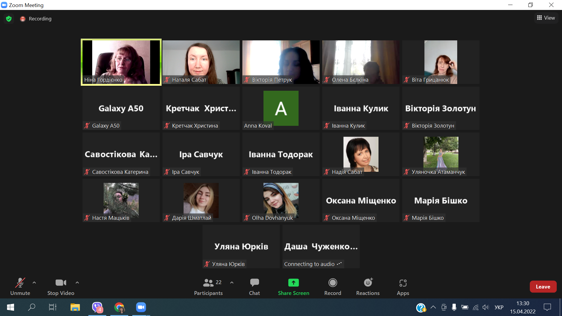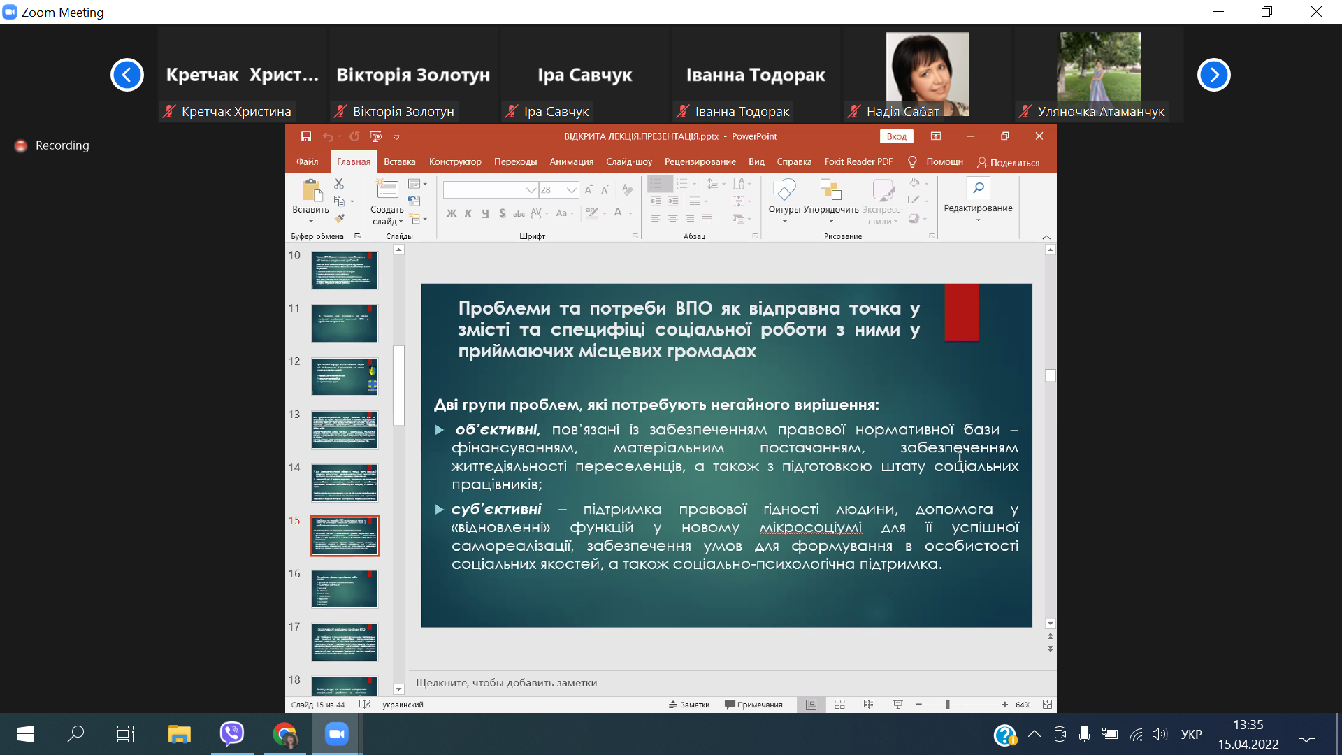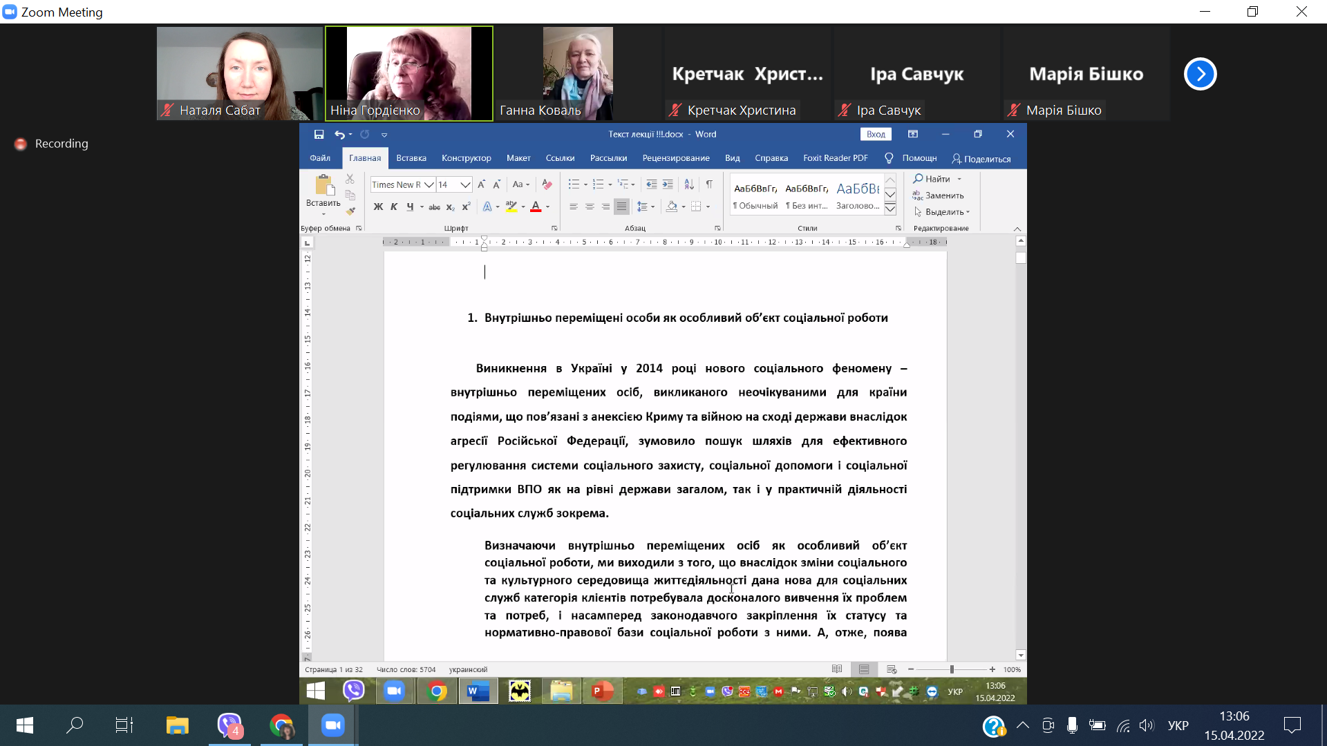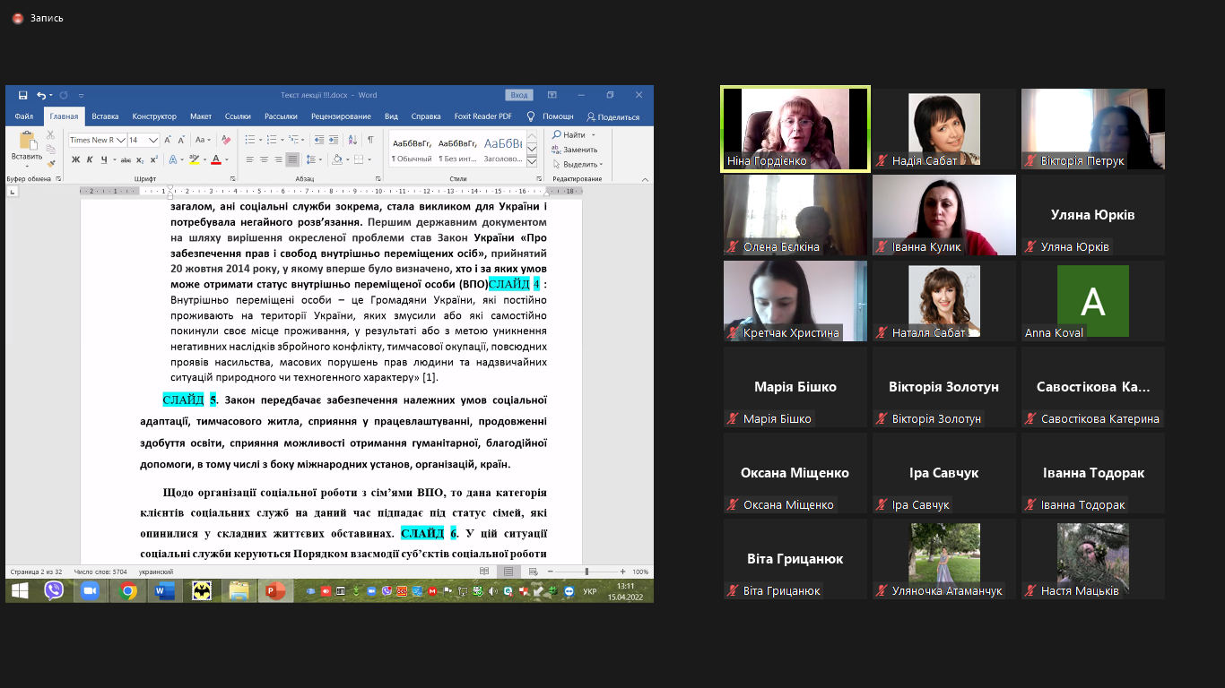 15 квітня викладачі кафедри соціальної педагогіки та соціальної роботи разом зі студентами спеціальності «Соціальна робота» прослухали гостьову лекцію доцента кафедри соціальної педагогіки та корекційної освіти Дрогобицького державного педагогічного університету імені Івана Франка Гордієнко Ніни Василівни на тему: «Технології соціальної роботи з сім’ями внутрішньо переміщених осіб». Лектор охарактеризувала категорію «внутрішньо переміщена особа», окреслила основні форми, засоби й методи допомоги ВПО, виокремила основні шляхи соціально-педагогічної підтримки. Зважаючи, що активні бойові дії сьогодні охоплюють більшу, порівняно з 2014 роком, територію України, що, зрозуміло, збільшує кількість ВПО, фахівці соціальної сфери опинилися перед новими викликами. За даними Міжнародної організації міграції, понад 6,5 млн українців були змушені переселитися в безпечніші області країни. Тому тема лекції є надзвичайно актуальною для майбутніх соціальних працівників, а зміст матеріалу сприятиме розвитку фахових компетентностей здобувачів вищої освіти.