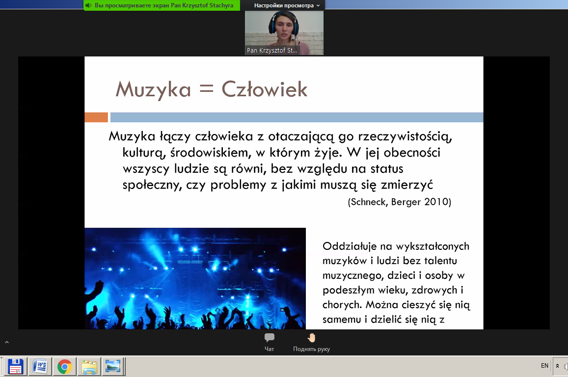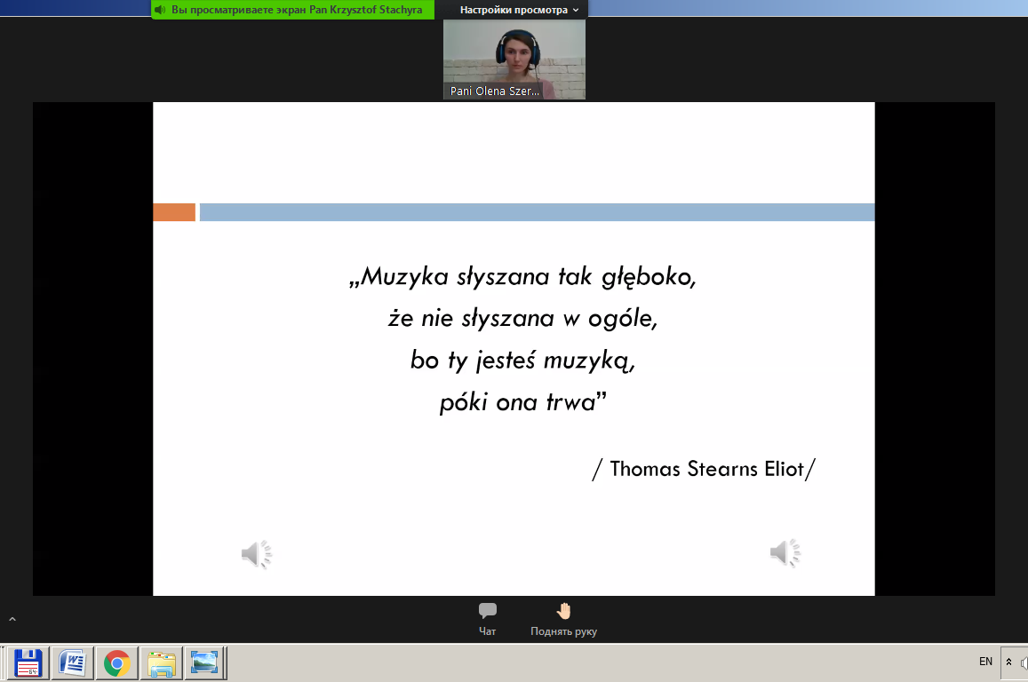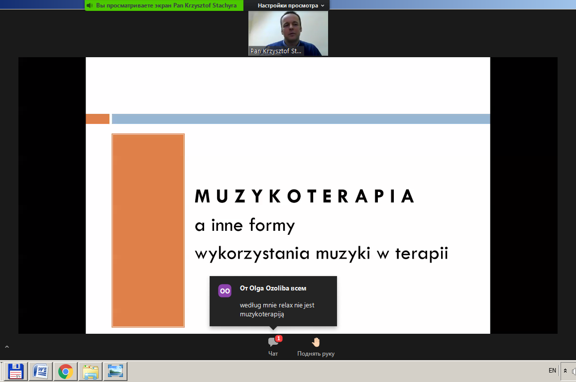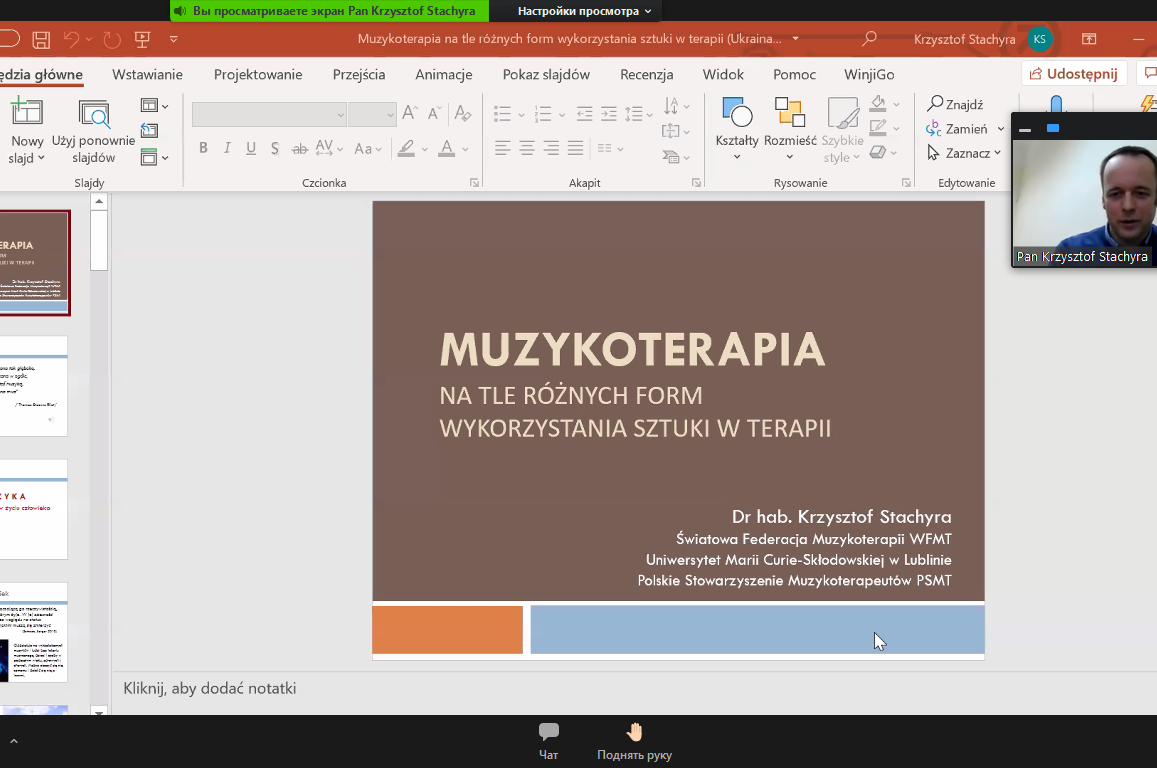 Викладачі кафедри Надія Сабат, Наталія Сабат взяли участь в обговоренні важливої теми: “Музикотерапія на тлі різних форм використання мистецтва в підтримці розвитку”. Огляд теми проводив музичний терапевт, педагог, доктор наук у галузі педагогіки, науковий і дидактичний працівник факультету педагогіки та психології Люблінського університету імені Марії Кюрі-Склодовської, голова правління Польської асоціації арттерапії та Польської асоціації музичних терапевтів Кшиштоф Стахира. Доповідач зазначив, що арт-терапію розуміють по-різному. Іноді цій формі терапії помилково приписують діяльність, яка базується на використанні мистецтва, але, фактично, не є арт-терапією. На прикладі музикотерапії лектор пояснив, чим ця форма терапії через мистецтво відрізняється від інших форм використання музики, в т.ч. трудотерапія музикою або так званих музичних ліків (ang. Music Medicine).