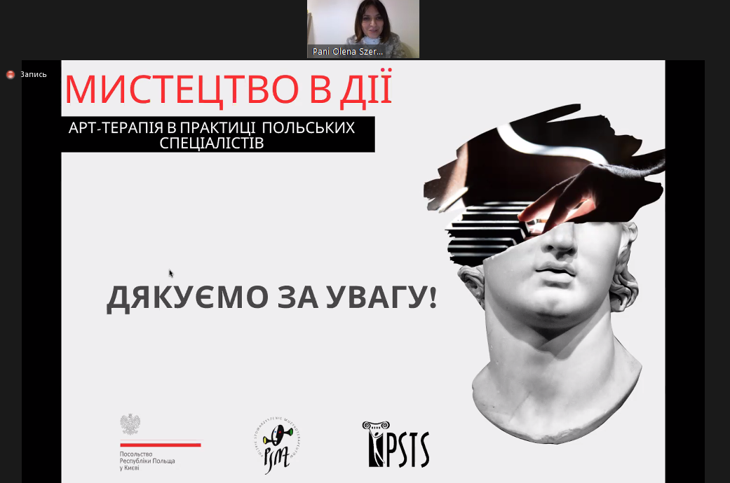 16 березня відбулася перша з шести запланованих он-лайн зустрічей з провідними фахівцями Польщі з циклу “Мистецтво в дії. Арт-терапія в практиці польських спеціалістів”. Із вітальним словом до слухачів звернулася керівниця науково-освітнього відділу Посольства Республіки Польща в Україні Єва Матушек-Загата.