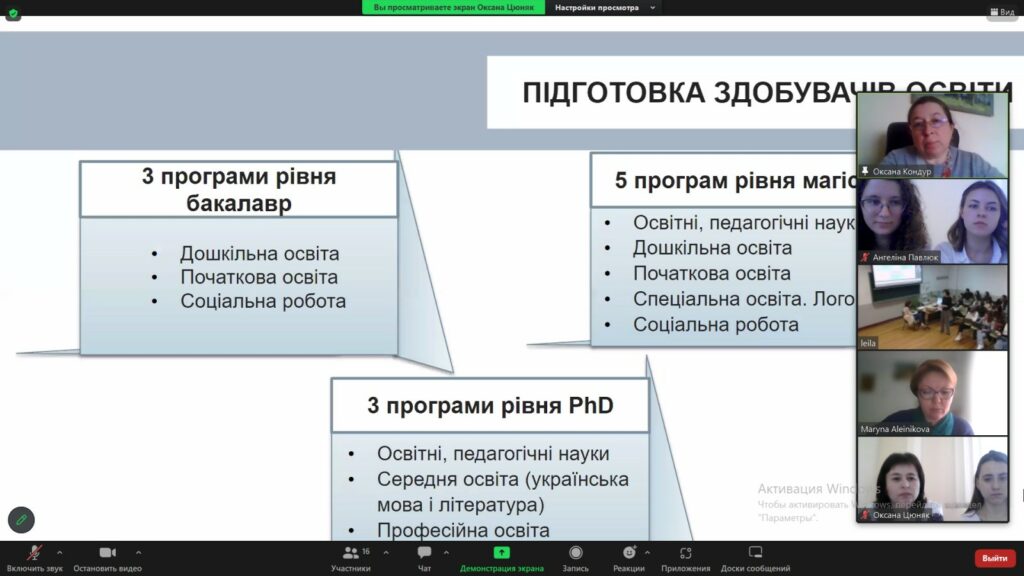 Професорка Оксана Цюняк поділилася із зарубіжними колегами досвідом організації практичної підготовки студентів спеціальностей «Дошкільна освіта » й «Початкова освіта». Наголосила, що професійно-педагогічна підготовка майбутніх вихователів та вчителів – це складний, багатогранний і тривалий процес, який здійснюється впродовж усього періоду навчання студентів. Вона є важливою складовою освітнього процесу, проводиться з метою закріплення і поглиблення теоретичних знань, набуття практичних навичок у межах майбутньої спеціальності.
