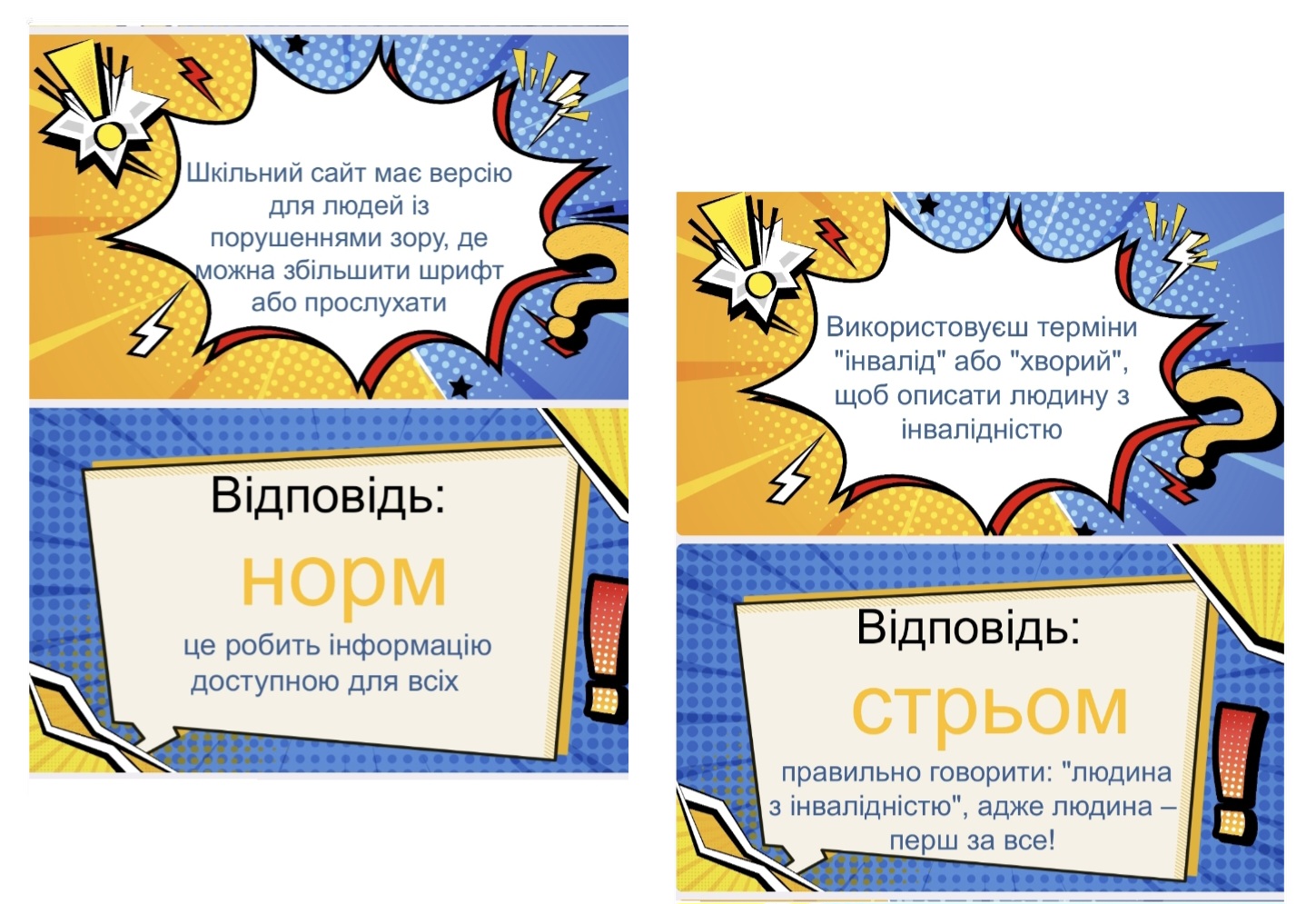 • обговорювали життєві ситуації через інтерактивну гру «Норм чи стрьом?», де мали змогу критично осмислювати приклади бар’єрів у повсякденному житті;