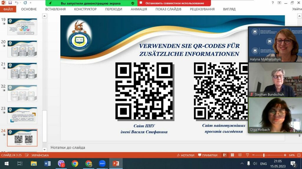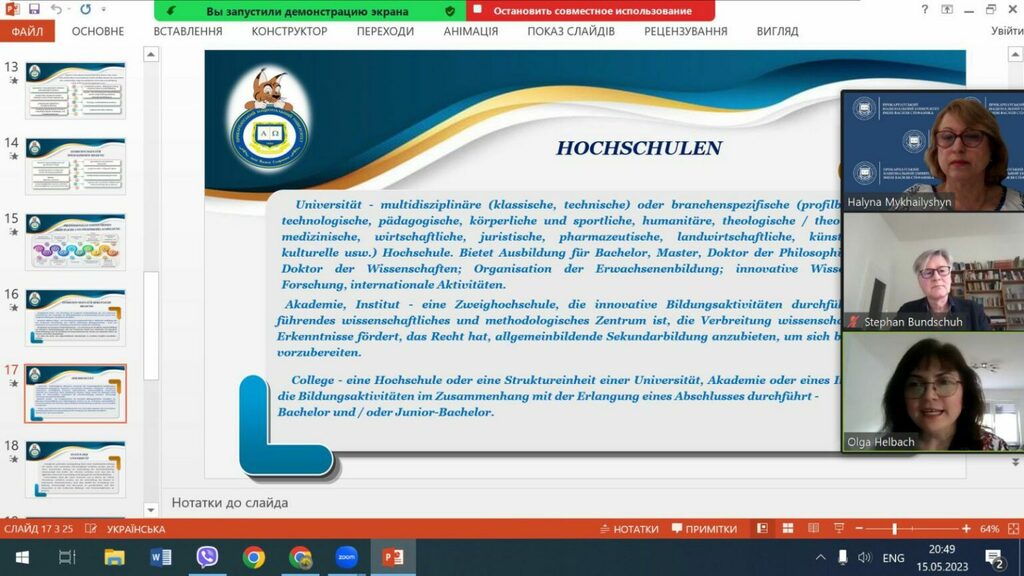 Основні акценти пані лекторка зробила на структурі української освітньої системи та сучасних викликах і ризиках соціальної роботи, зумовлених воєнною агресією росії. Галина Йосипівна зазначила важливість та затребуваність соціальних працівників та соціальних педагогів для психологічної стабілізації здобувачів освіти та створення безпечного освітнього середовища. Модератор заходу – професор кафедри соціальної роботи університету HOHSCHULE (Koblenz) Стефан Бундшух, керівник відділу суспільних наук Університету Кобленца (Німеччина), відзначив активну зацікавленість виступом професорки Михайлишин, оскільки в обговоренні лекції взяли участь понад 20 професорів із пів сотні присутніх.
