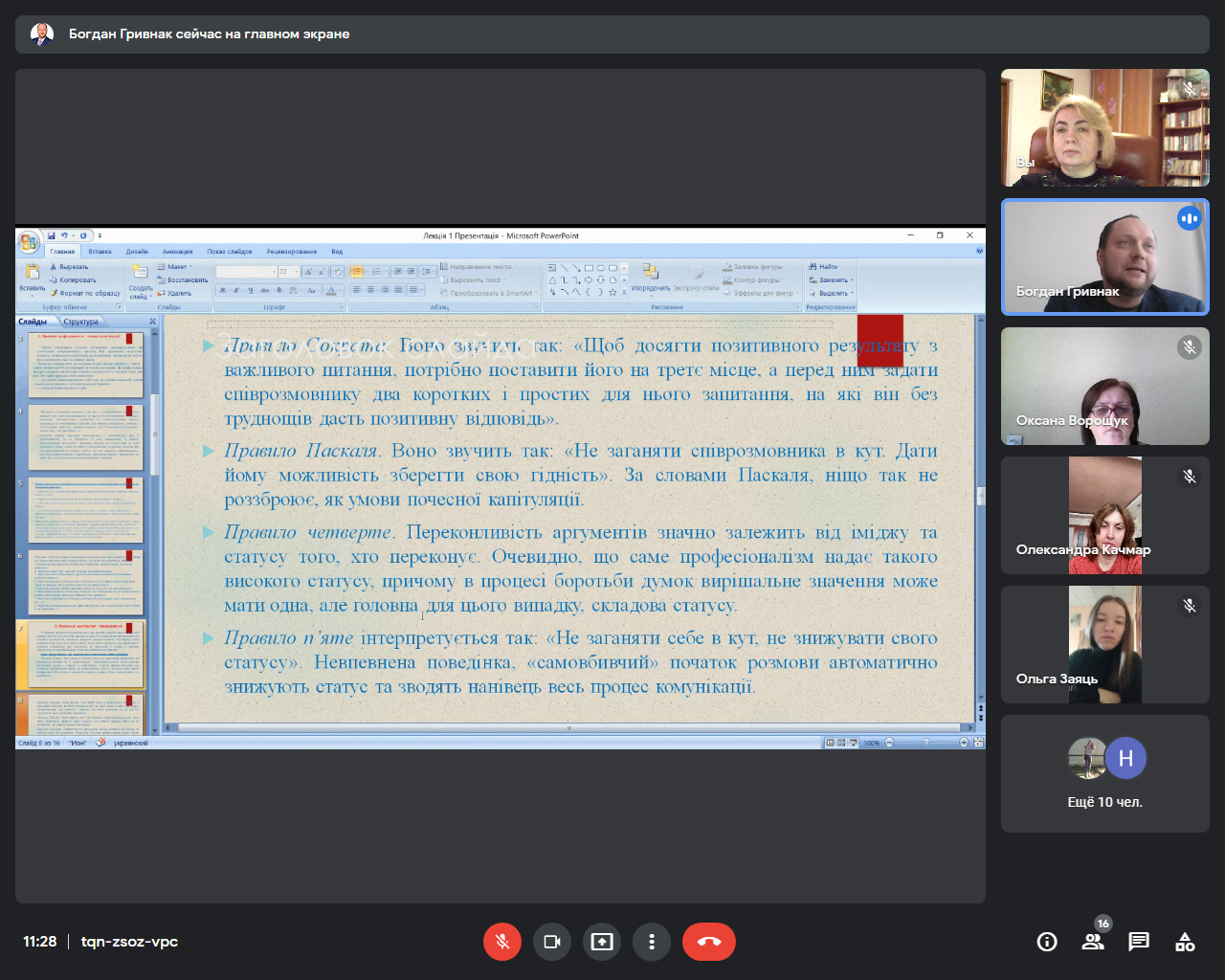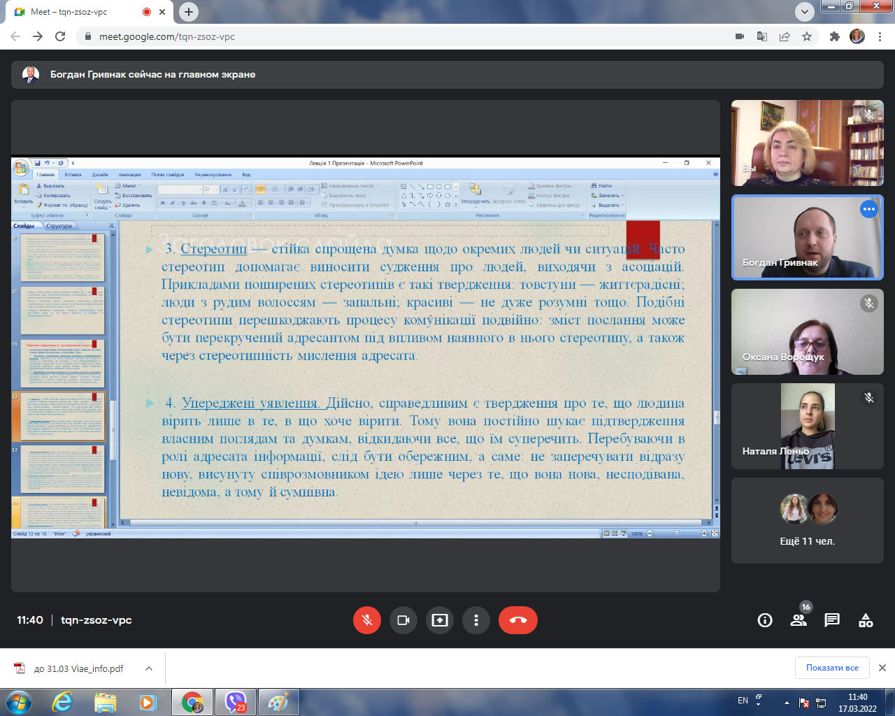 Важливим акцентом лекції, що супроводжувалася презентацією, став аналіз особливостей ролі міжособистісної комунікації у процесі ділового спілкування.