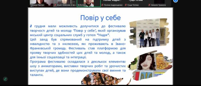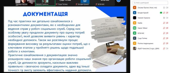 На захисті виробничої практики здобувачі освіти представили фото- і відеопрезентації своєї діяльності на базах практики, поділилися враженнями від проходження практики, надання соціальної підтримки особам і сім’ям, які належать до вразливих груп населення та перебувають у складних життєвих обставинах, аналізували їх ефективність.