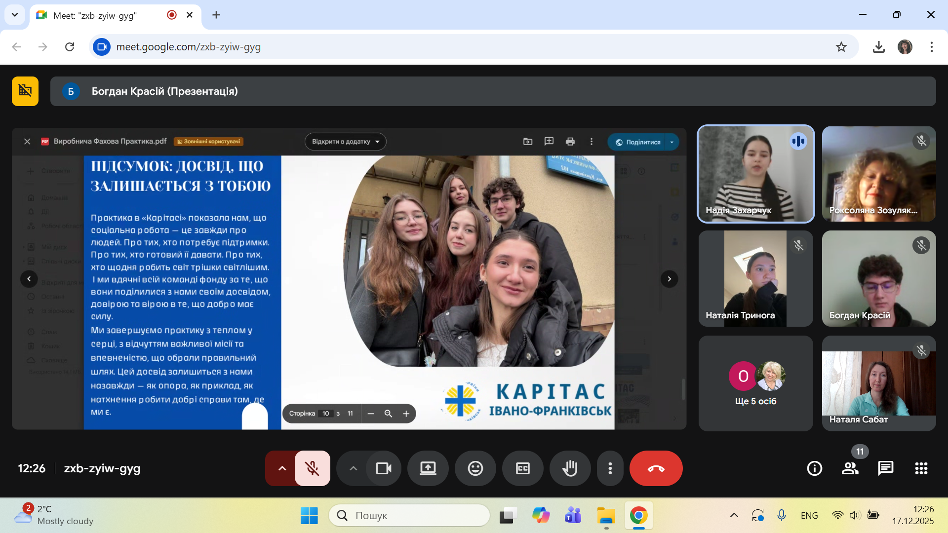 17 грудня 2025 року відбувся захист виробничої практики фахової студентів четвертого курсу спеціальності «Соціальна робота». Захід став важливим підсумковим етапом практичної підготовки здобувачів вищої освіти та складовою формування їхньої професійної готовності до майбутньої діяльності у сфері соціальної роботи.