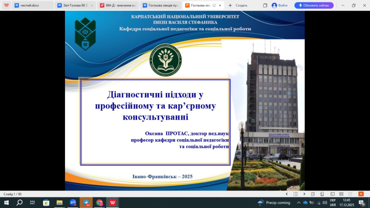 У рамках заходів тижня очного навчання, 17 грудня на факультеті психології, історії та соціології Херсонського державного університету професорка кафедри соціальної педагогіки та соціальної роботи Оксана Протас провела  гостьову лекцію на тему: «Діагностичні підходи у професійному та кар’єрному консультуванні» для магістрантів спеціальності «Соціальна робота».