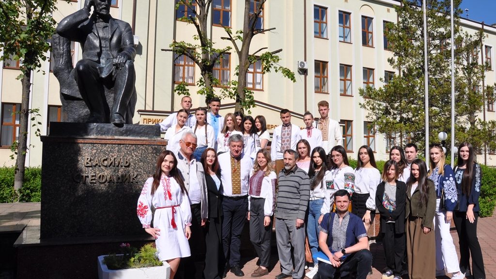 Після завершення телемосту студенти трьох університетів – Прикарпатського національного університету, Херсонського державного університету та Донбаської національної академії будівництва та архітектури – разом з ректорами Ігорем Цепендою, Олександром Співаковським та Василем Кравцем зробили спільне фото біля пам’ятника Василеві Стефанику.