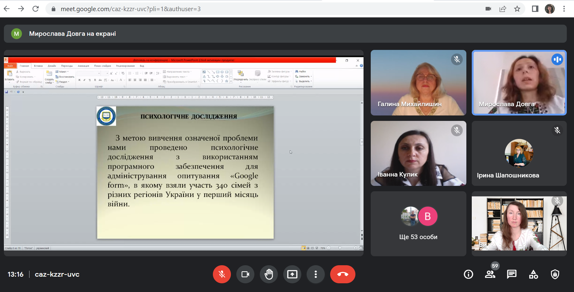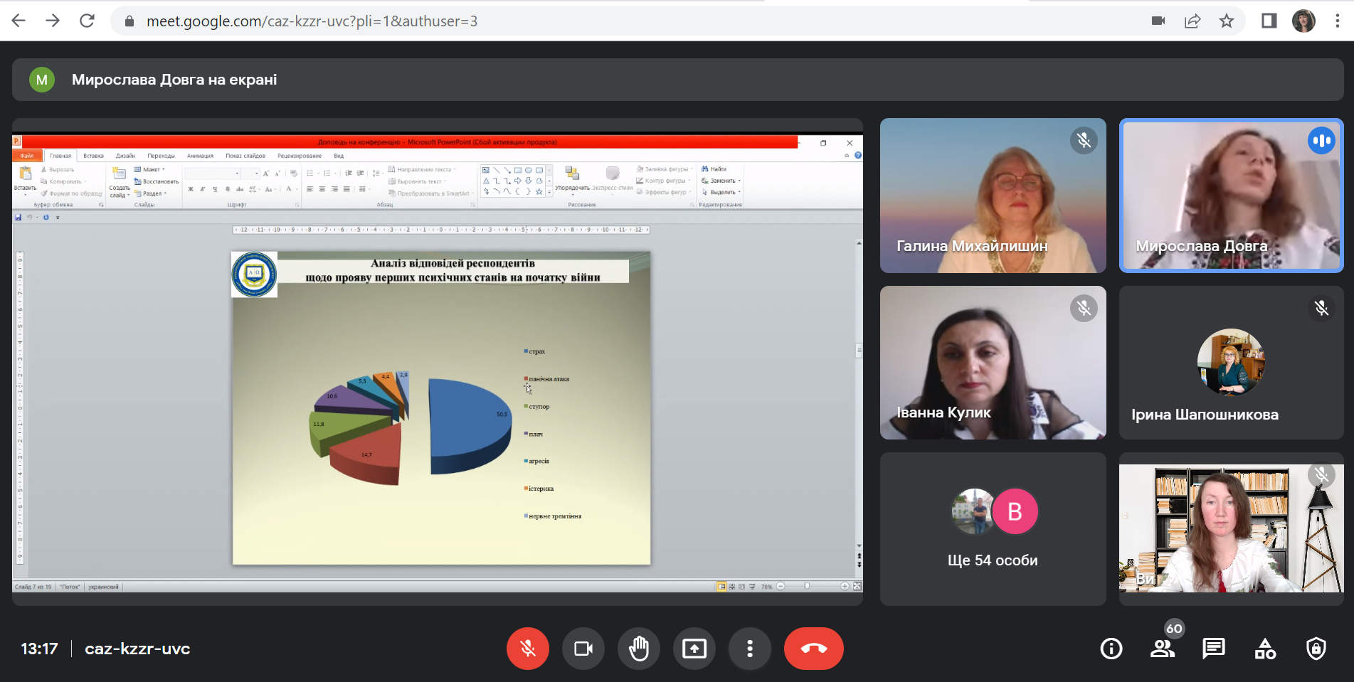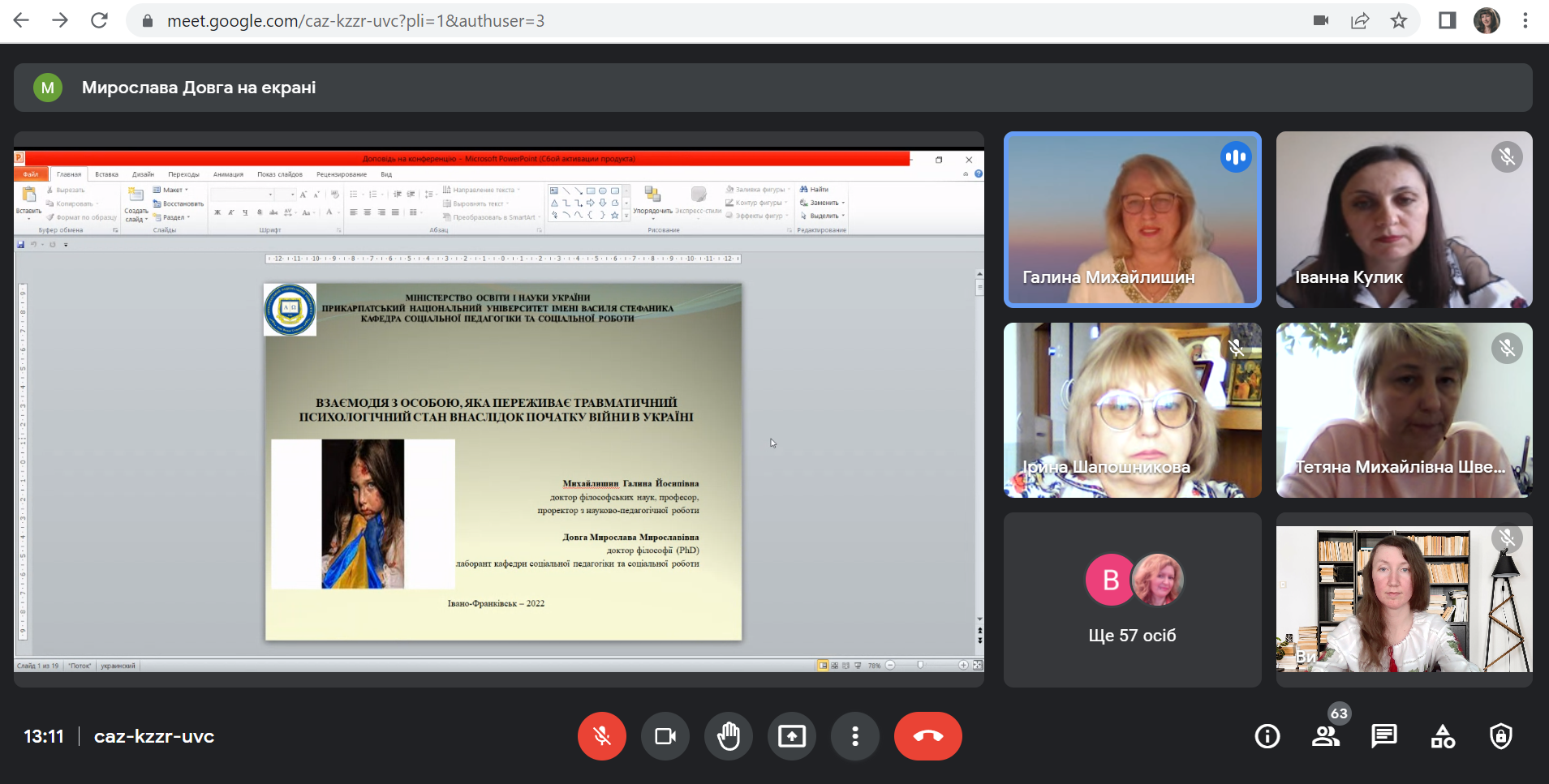 Саме тому  значний інтерес у присутніх викликала доповідь «Взаємодія з особою, яка переживає травматичний психологічний стан внаслідок початку війни в Україні» (доповідачі Галина Михайлишин доктор філософських наук, професор, професор кафедри соціальної педагогіки та соціальної роботи, проректор з науково-педагогічної роботи Прикарпатського національного університету імені Василя Стефаника, Мирослава Довга доктор філософії (PhD), лаборант кафедри соціальної педагогіки та соціальної роботи). Те, з чим стикнулися українці 24 лютого, зазначили доповідачі, стало новим травматичним досвідом. Зараз багато осіб потребують стабілізації емоцій, думок, стосунків. Зазвичай сім’ї мають досвід і традиції виходу зі складних життєвих обставин, однак сучасна ситуація є настільки складною, що людям важко спілкуватися, їхні наміри невизначені, непевні, неорганізовані. Для багатьох осіб, які переживають травматичний психологічний стан, потрібна допомога фахівця. Доповідачі на основі масштабного опитування (340 сімей з різних регіонів України у перший місяць війни) охарактеризували типові стани, які переживають ВПО; озвучили низку корисних практичних порад для першої психологічної допомоги, піклування про себе й інших. Розповіді очевидців із Київщини, Харківщини підтвердили як актуальність теми, так і достовірність результатів проведеного дослідження. Лейтмотивом усіх виступів стала думка про те, що обирати, планувати майбутнє найкраще на рідній землі. Де б ми не були у світі – ніде не почуваєшся так, як вдома, в Україні.
