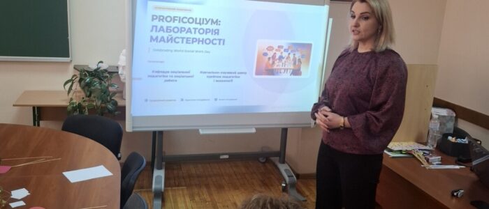 До Всесвітнього дня соціальної роботи доценти кафедри соціальної педагогіки та соціальної роботи Ірина Дідух — викладач професійної майстерності, та Ірина Комар — викладач тренінгових технологій, провідний фахівець Навчально-наукового центру проблем педагогіки і психології — у співпраці з Центром провели інтерактивний практикум «PROfiСоціум: лабораторія майстерності» для студентів освітніх програм «Соціальна педагогіка» та «Соціальна робота».