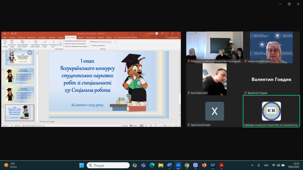 28 лютого професорки кафедри соціальної педагогіки та соціальної роботи Роксоляна Зозуляк-Случик, Галина Михайлишин, Оксана Протас взяли участь в онлайн-зустрічі зі студентами 4-х курсів (денної і заочної форм навчання) педагогічного факультету щодо умов вступу в магістратуру 2025 року, особливостей освітніх програм Читати далі