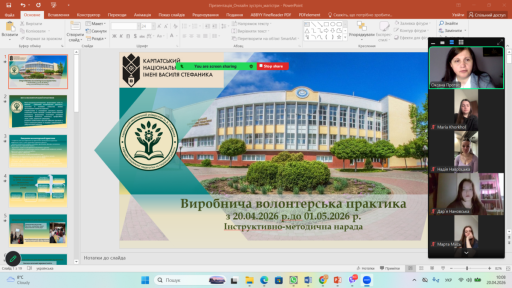 20 квітня відбулася настановча онлайн-нарада з організаційно-методичних питань проходження виробничої волонтерської практики студентами ІІ курсу ОП «Соціальна робота». Волонтерство сьогодні є не лише проявом громадянської позиції, а й простором людяності, де соціальна підтримка стає спільною цінністю. А через практичну діяльність Читати далі