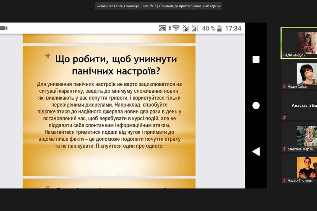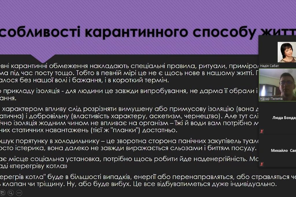 Надзвичайно старанно підійшли до виконання завдань студенти групи СР-11м Назар Пилипів (“Карантинний спосіб життя особистості і суспільства як стимул до раціональної перебудови свідомості, поведінки та діяльності”), Анастасія Балан (“Психологічний захист особистістю імунної системи свого організму під час коронавірусної пандемії”), Надія Байдюк (“Психологічна профілактика паніки та засоби її подолання”). Про шляхи збереження здоров’я учасників освітнього процесу в умовах пандемії COVID-19 йшлося у виступі студентки групи СРСПз-11м Людмили Боднарюк. Студентка цієї ж групи Мар’яна Деренюк висвітлила особливості самоусвідомлення і саморегуляції дорослої людини в умовах пандемії. Розкриваючи роль лідера в забезпеченні психологічного здоров’я та благополуччя персоналу закладу вищої освіти в умовах пандемії, Наталія Куцалаба поділилася особистим досвідом у напрямі співпраці з працівниками Долинського центру підтримки дітей та сімей. Про вплив соціальної ізоляції на виникнення відстороненості та тривожності в особистості розповіла Анна Пітиляк, соціальний педагог Яворівського ліцею “Гуцульщина” Косівської ОТГ.