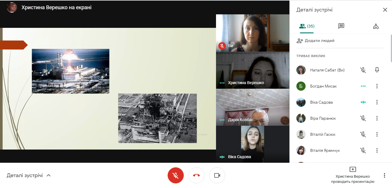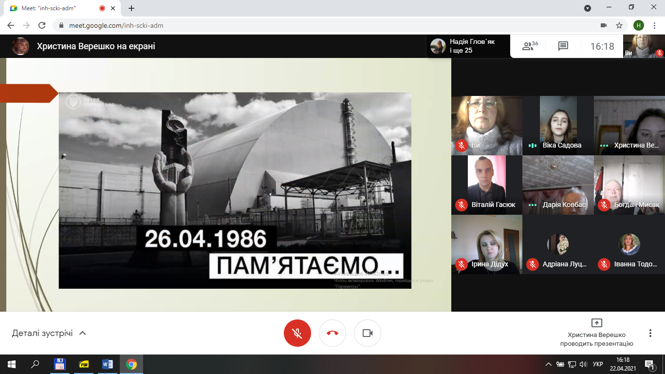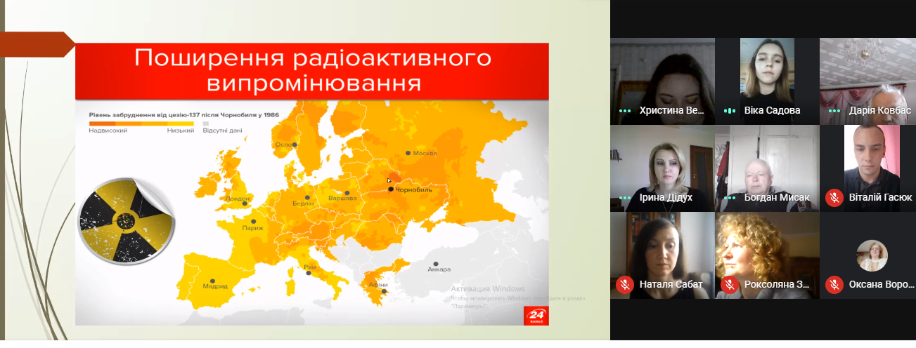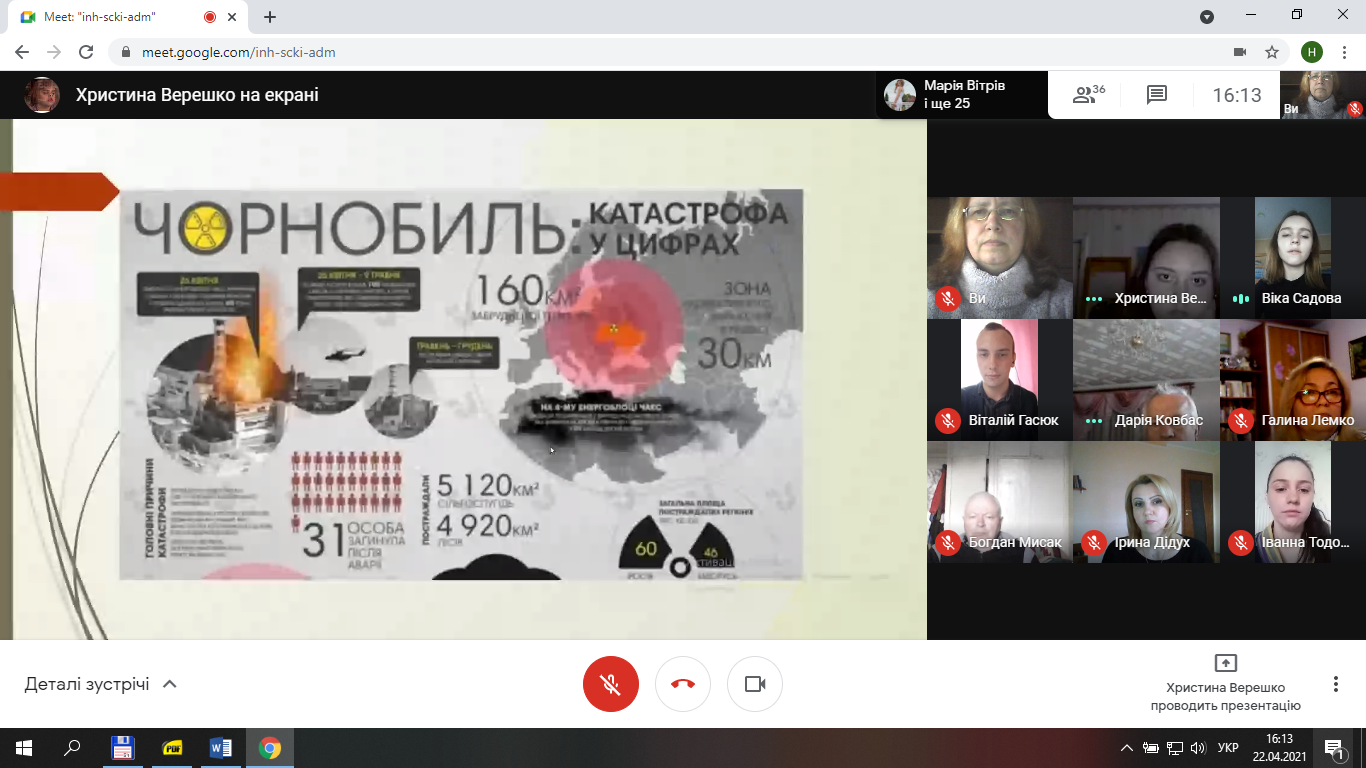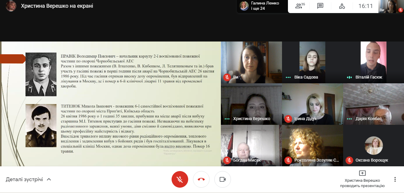 22 квітня студентами спеціальності “Соціальна робота” і викладачами кафедри соціальної педагогіки та соціальної роботи за підтримки декана педагогічного факультету Кондур О.С. до 35-х роковин Чорнобильської катастрофи було проведено круглий стіл в форматі онлайн “Полинова пам’ять”. На початку заходу Дідух І. Я. зазначила, що наслідки однієї з найбільших в історії людства трагедії складні та багатоаспектні, вони зачіпають усі сторони людського буття, а її ризики тривають і триватимуть ще довго. “Біль Чорнобиля з роками не зникає, – зауважила Сабат Н. І., – адже кожен, хто брав участь у ліквідації наслідків вибуху на 4-му блоці Чорнобильської АЕС, заплатив за це власним здоров’ям і життям. Тому як полин гіркою є пам’ять про ці події”.