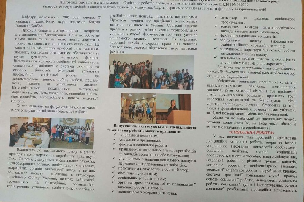 Метою практики є оволодіння студентами професійними функціями соціального педагога. У процесі проходження практики в ліцеї №22 Івано–Франківської міської ради студенти ознайомлюються із специфікою соціально-педагогічної діяльності в умовах закладу, вивчають основні напрямки діяльності і функції соціального педагога, документацію та основні форми звітності. Важливим напрямком діяльності соціального педагога є профорієнтаційні заходи. Студентками Х.Винничук і В.Феденько ( 9-Є клас), В.Феденько (9-Ж клас), В.Серемчук (11-Б клас) проведено інформаційні бесіди з метою ознайомлення школярів з професією соціального педагога. Студентки розповіли про умови вступу до Прикарпатського національного університету ім.В.Стефаника загалом, і на спеціальність 231 «Соціальна робота» ОП «Соціальн педагогіка», зокрема. Виходячи з власного досвіду оволодіння фахом соціального педагога, студентки змістовно й захоплююче розповіли про необхідність в сучасному глобалізованому світі зазначеної професії, її переваги й перспективи. Для кращого ознайомлення з особливостями вступу та професійною діяльністю соціальних педагогів, студентками було роздано буклети та надано інформацію про сторінки кафедри соціальної педагогіки та соціальної роботи в соціальних мережах.