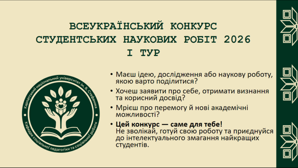 З метою підвищення якості підготовки кваліфікованих фахівців, пошуку обдарованої студентської молоді, стимулювання творчої праці студентів, педагогічних і науково-педагогічних працівників та на виконання наказу ректора Карпатського національного університету імені Василя Стефаника «Про проведення Всеукраїнської студентської олімпіади та Всеукраїнського конкурсу студентських наукових робіт з галузей знань і спеціальностей у 2025/2026 навчальному році» № 1060 від 10.11.2025 року на кафедрі соціальної педагогіки та соціальної роботи буде проведено І тур конкурсу студентських наукових робіт зі спеціальностей І 10 Соціальна робота та консультування; І 11 Дитячі та молодіжні служби.