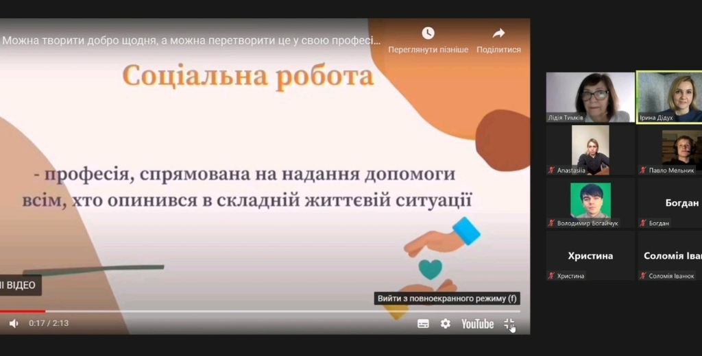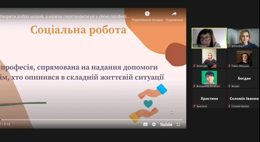 Упродовж квітня місяця викладачами кафедри Іриною Дідух і Лідією Тимків проведено чотири онлайн-консультації для абітурієнтів та їхніх батьків. Такі заходи реалізовано 07, 14, 20 і 27 квітня для старшокласників Івано-Франківських ліцеїв № 2, № 19, № 26 Івано-Франківської міської ради, Отинійського ліцею Отинійської селищної ради, Лисецького навчально-виховного комплексу «Загальноосвітня школа І-ІІІ ступенів» Тисменицької районної ради, Солотвинського навчально-виховного комплексу «Загальноосвітня школа І-ІІІ ступенів – ліцей» Солотвинського ліцею Солотвинської селищної ради, Хімчинського ліцею «Інтелект» Рожнівської ОТГ Косівського району, а також для бажаючих здобувати вищу освіту за ОР «магістр». Викладачі ознайомили учасників зустрічі з перевагами навчання на Педагогічному факультеті, умовами вступу на навчання за спеціальністю «Соціальна робота» (освітні програми «Соціальна робота», «Соціальна педагогіка»).