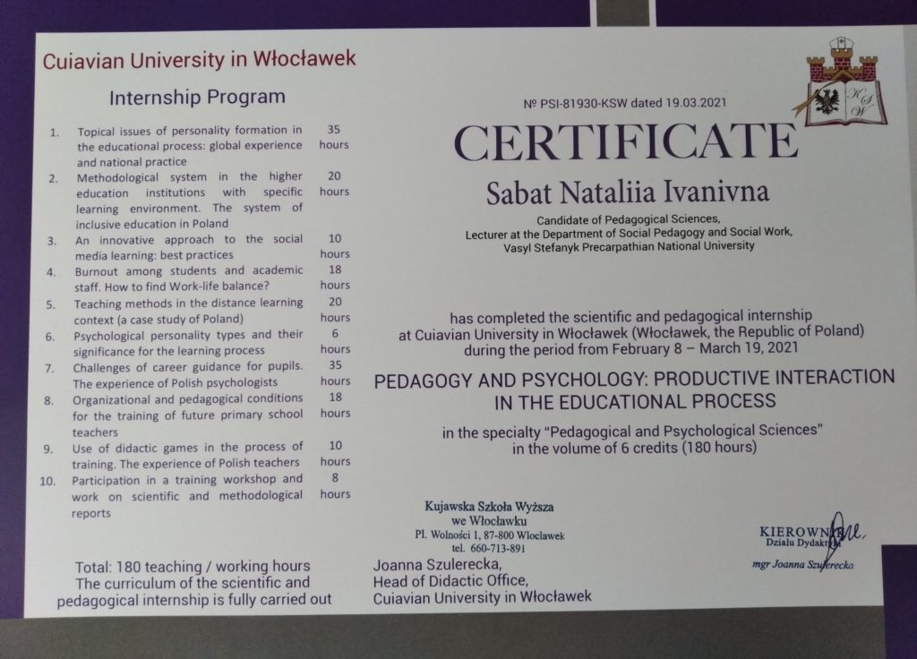 ВИКЛАДАЧ КАФЕДРИ СОЦІАЛЬНОЇ ПЕДАГОГІКИ ТА СОЦІАЛЬНОЇ РОБОТИ САБАТ НАТАЛІЯ ІВАНІВНА ПРОЙШЛА МІЖНАРОДНЕ НАУКОВО-ПЕДАГОГІЧНЕ СТАЖУВАННЯ