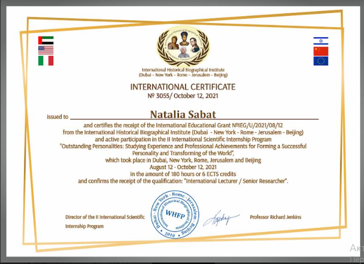 Стажування відбувалося в Міжнародному Історико-Біографічному Інституті у Дубаї, Римі, Нью-Йорку, Єрусалимі, Пекіні з 12 серпня 2021 року по 12 жовтня 2021 року. Тривалість стажування – 180 год. (6 кредитів), з них 15 годин (0,5 кредита) було відведено під питання інклюзивної освіти. Тема стажування – «Видатні Особистості: Читати далі